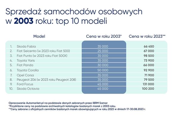Z archiwalnych danych sprzedażowych zgromadzonych przez Instytut Samar wynika, że w roku 2003 najchętniej kupowano Skodę Fabię, której (według cenników z tamtego okresu) podstawowa wersja kosztowała wówczas ok. 35 tys. zł. Drugim najpopularniejszym modelem był Fiat Seicento, kosztujący w przybliżeniu min. 25 tys. zł, a trzecim Fiat Punto (wyjściowo ok. 35 tys. zł). Cena aktualnie dostępnej Skody Fabii zaczyna się od 66,5 tys. zł (niemal dwukrotny wzrost względem 2003 r.), zaś cena modeli marki Fiat wzrosła prawie trzykrotnie - Fiat 500, którego można uznać za następcę Fiata Seicento, kosztuje min. 67 tys. zł, a zajmujący w gamie tego producenta podobne miejsce jak niegdyś Punto, model 500X - aż 98,5 tys. zł. Największy skok cenowy wśród dziesięciu najchętniej kupowanych w 2003 roku modeli odnotował natomiast Ford Focus - na przestrzeni 20 lat jego cena wzrosła z ok. 45 tys. zł do 131 tys. zł obecnie.