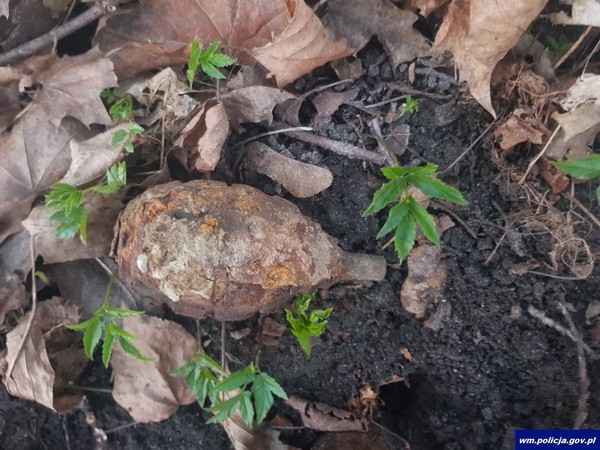 Wczoraj po godzinie 18:00 oficer dyżurny mrągowskiej policji otrzymał zgłoszenie o zalezieniu niewybuchu. Znaleziska dokonano na trasie Mrągowo-Wymysły na brzegu cieku wodnego łączącego Jezioro Kocie z jeziorem Juno w odległości około 30 metrów od jezdni. Na miejsce natychmiast pojechali policjanci, którzy potwierdzili znalezisko - był to granat F1 okresu II Wojny światowej i zabezpieczyli miejsce do czasu przyjazdu jednostki saperskiej z Orzysza.