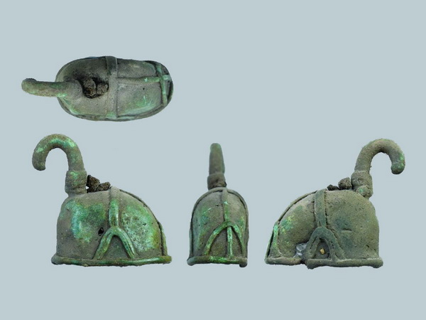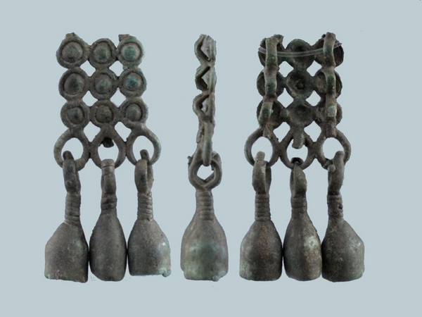 Archeolodzy odkryli również sześć odlewanych i wydrążonych wisiorków zawieszonych na skórzanym sznurku z nawleczonymi metalowymi koralikami, typowymi dla kultur ugrofińskich oraz okrągłą, ażurową tabliczkę z zapięciem.